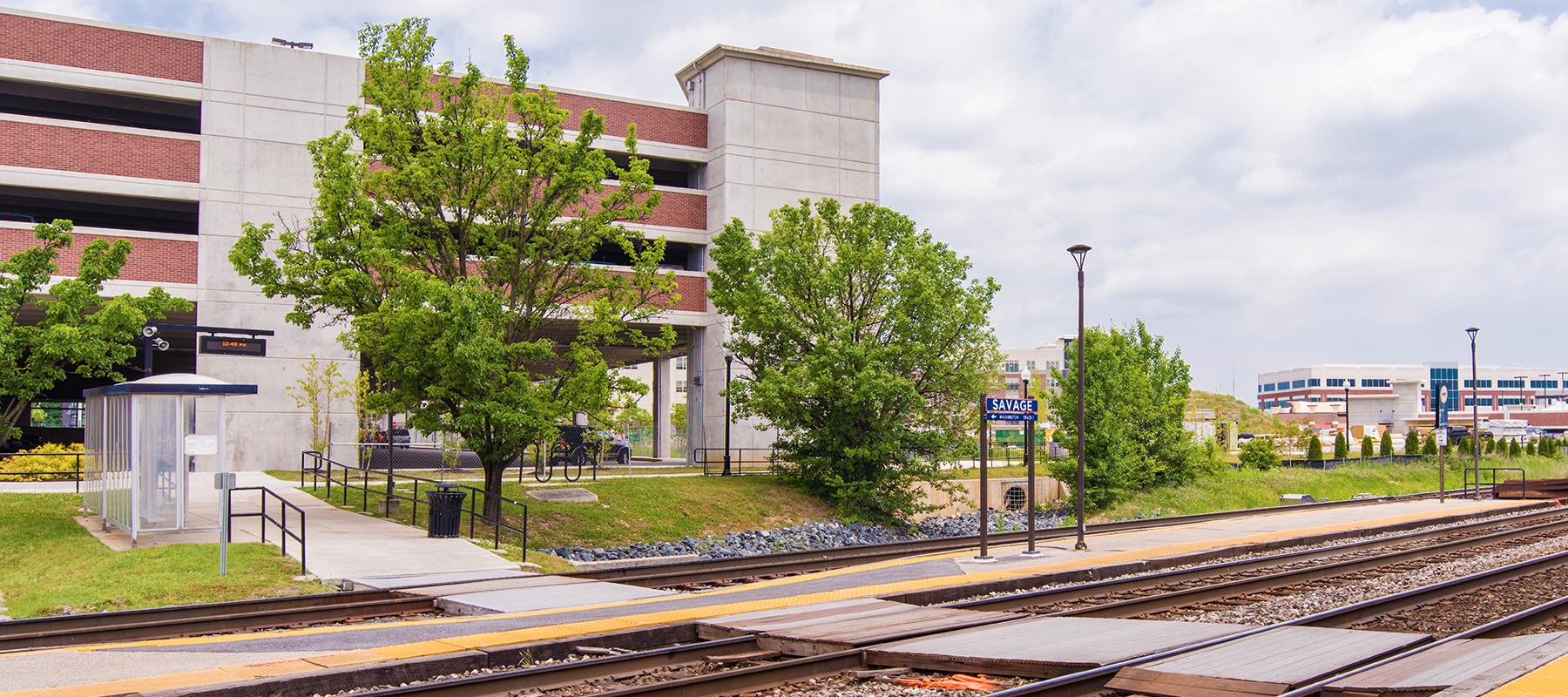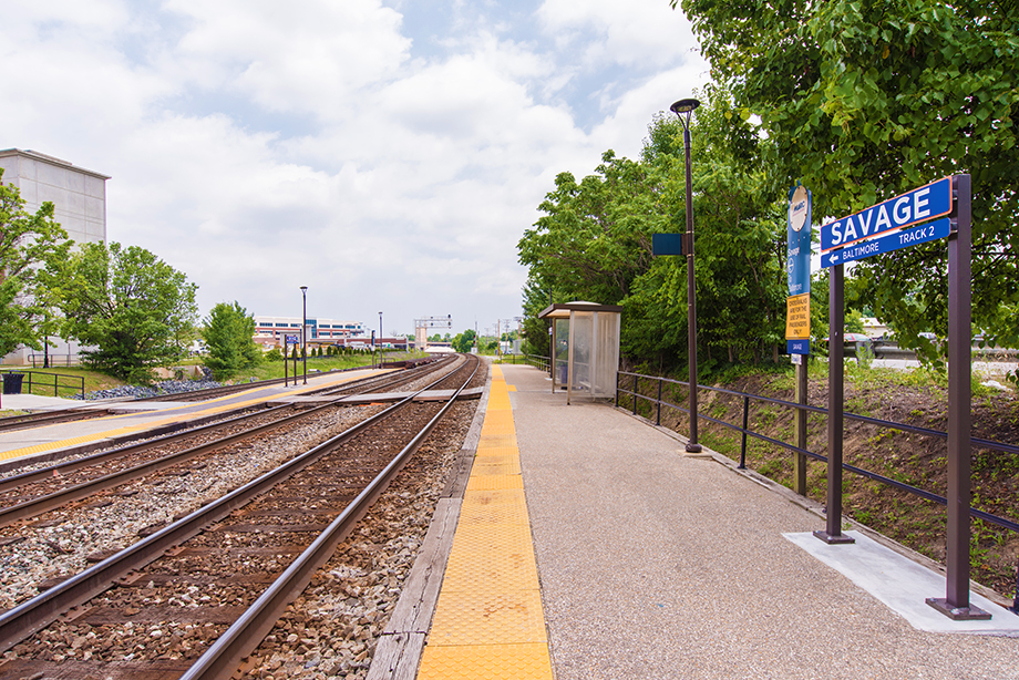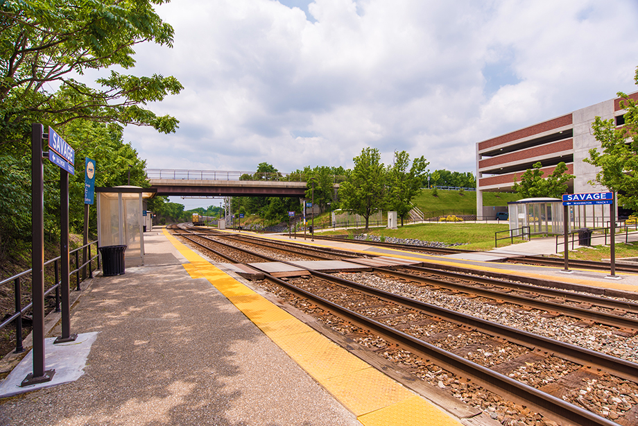 The line that serves this station - the "Camden" line - runs between Union Station in Washington, D.C. to the south, where it connects to the D.C. Metrorail subway network, and, to the north, the Inner Harbor/Camden Yard area of downtown Baltimore, where it connects to Baltimore's light rail system. This line also has several stops in between Baltimore and Washington, including College Park (University of Maryland). MARC currently operates nine trains each way on this line on weekdays. Between 400 and 500 rail commuters park at the Savage station daily, and 5000 daily commuters ride this line. The rail tracks adjacent to the property also carry an infrequent number of CSX freight trains, which service local distribution facilities as well, to the north and south of the site. Total rail traffic is sufficiently infrequent that MARC rail station patrons cross the tracks at grade to board or alight from trains. The development plan includes station improvements, including the addition of a pedestrian bridge from the new commuter garage to the station platforms. The MARC Station Garage is also served by two bus lines.
